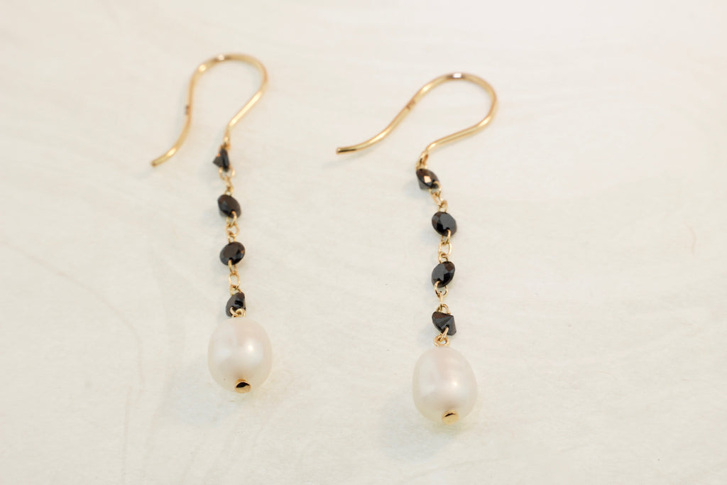 We love the simplicity and elegance of black and white combination. These black diamond and pearl earrings will add a beautiful finish to your style. The diamond is drilled and linked together with a simple chain. Incredibly light and easy to wear. These earrings are designed to catch light with your movement. Handcrafted in 14K gold.